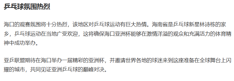 亚洲乒乓球联盟在官宣的文章中提到,海南省是乒乓球新星林诗栋的家乡,乒乓球运动在当地广受欢迎,这将确保海口亚洲杯能够在激情洋溢的观众和充满活力的体育精神中成功举办。