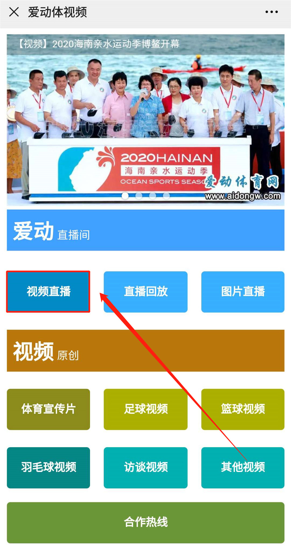 ①关注“爱动体育网”微信公众号并进入,点击菜单栏左下角【直播】,即可观看;