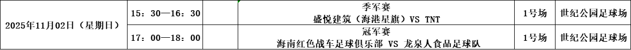 按赛程,11月2日下午15点30分率先开始打响3-4名争夺,由盛悦建筑(海港星旗)VS TNT队。之后,决赛将重磅打响,海南红色战车足球俱乐部VS龙泉人食品足球队。