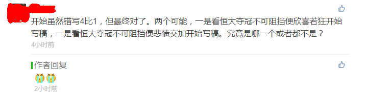 “两个可能,一是看恒大夺冠不可阻挡便欣喜若狂开始写稿,一是看恒大夺冠不可阻挡便悲愤交加开始写稿。究竟是哪一个或者都不是?”