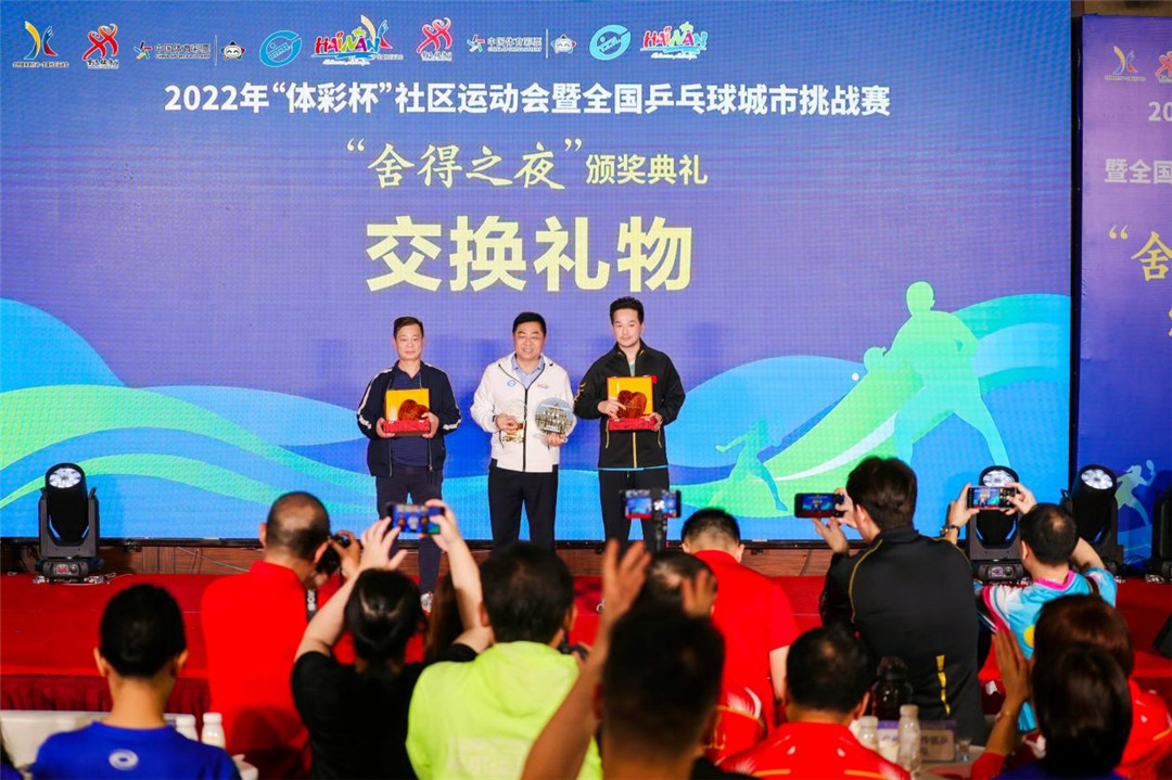 爱动体育讯 3月12日晚,2022年“体彩杯”社区运动会暨全国乒乓球城市挑战赛闭幕式“舍得之夜”在海口举行,经过3天角逐,公开组、乒协组、公务员组3个组别,团体、单打2个大项、15个小项比赛的比赛已全部完赛。