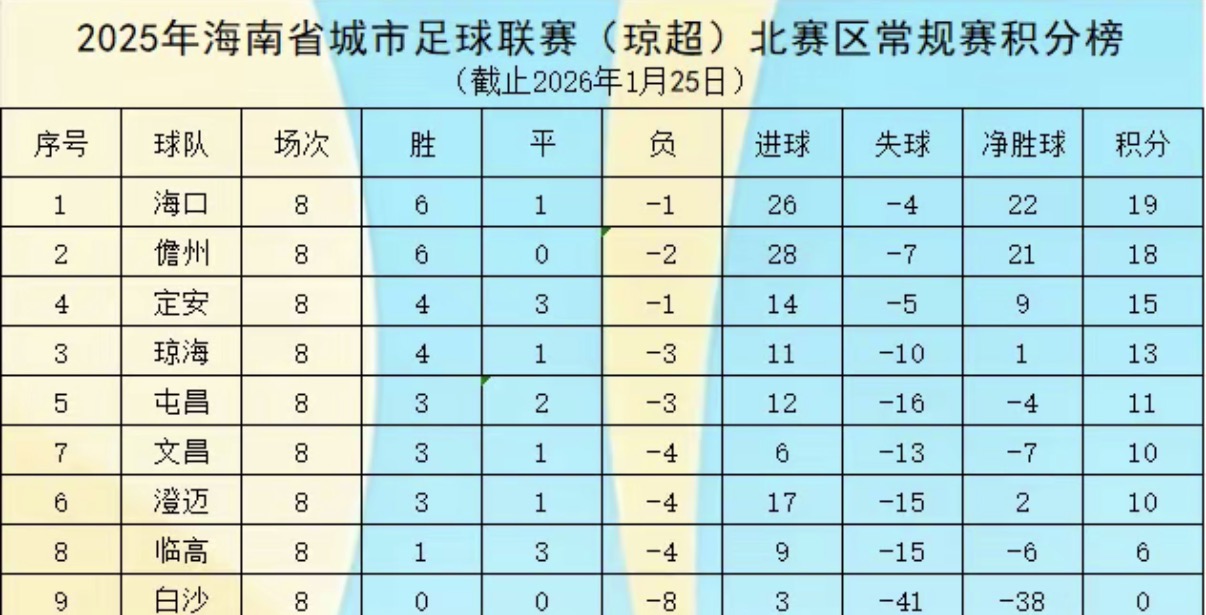 爱动体育讯 1月25日,“启航自贸港”第一届海南省城市足球联赛结束常规赛全部较量。经过9轮共72场比赛,琼超八强名单正式确定。南区晋级的队伍为琼中队、昌江队、万宁队和三亚队;北区晋级球队包括海口队、儋州队、定安队和琼海队。
