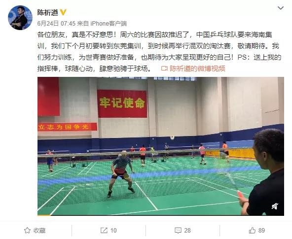 此前,在陵水集训的国家羽毛球队教练员陈祈遒就曾透露国乒也要来海南集训的消息。陈祈遒在微博发布:“各位朋友不好意思,周六(6月27日)的比赛要推迟了,中国乒乓球队要来海南集训,我们羽毛球队将转到东莞集训,到时候再举行混双的淘汰赛,敬请期待。”