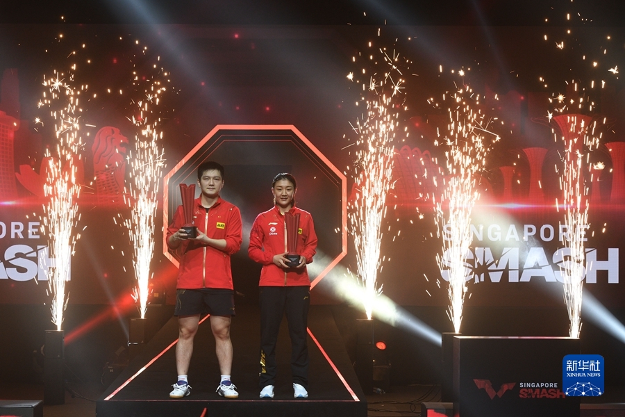 樊振东(左)、陈梦(右)分别获得新加坡大满贯男、女单打冠军。图源:新华社