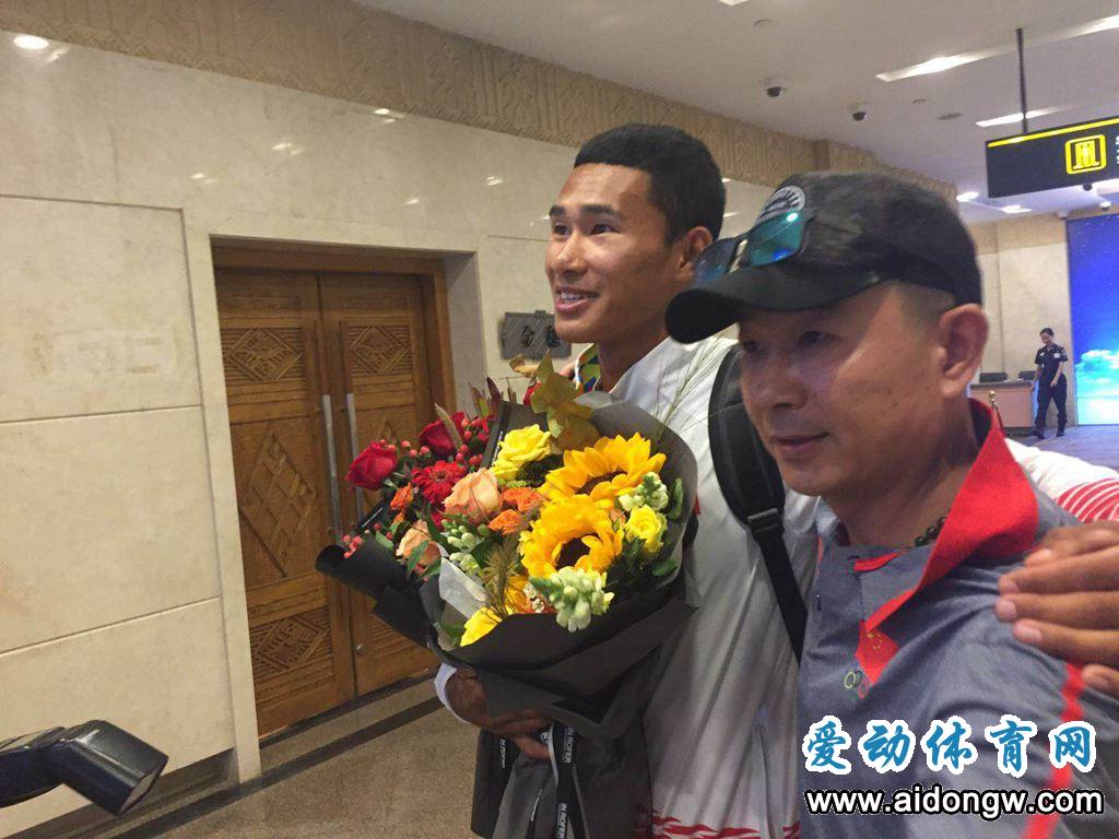 爱动体育讯 今日下午16:30,2018雅加达亚运会帆板RS:X级比赛冠军、海南首枚亚运会帆板金牌获得者毕焜回到海口市美兰机场。