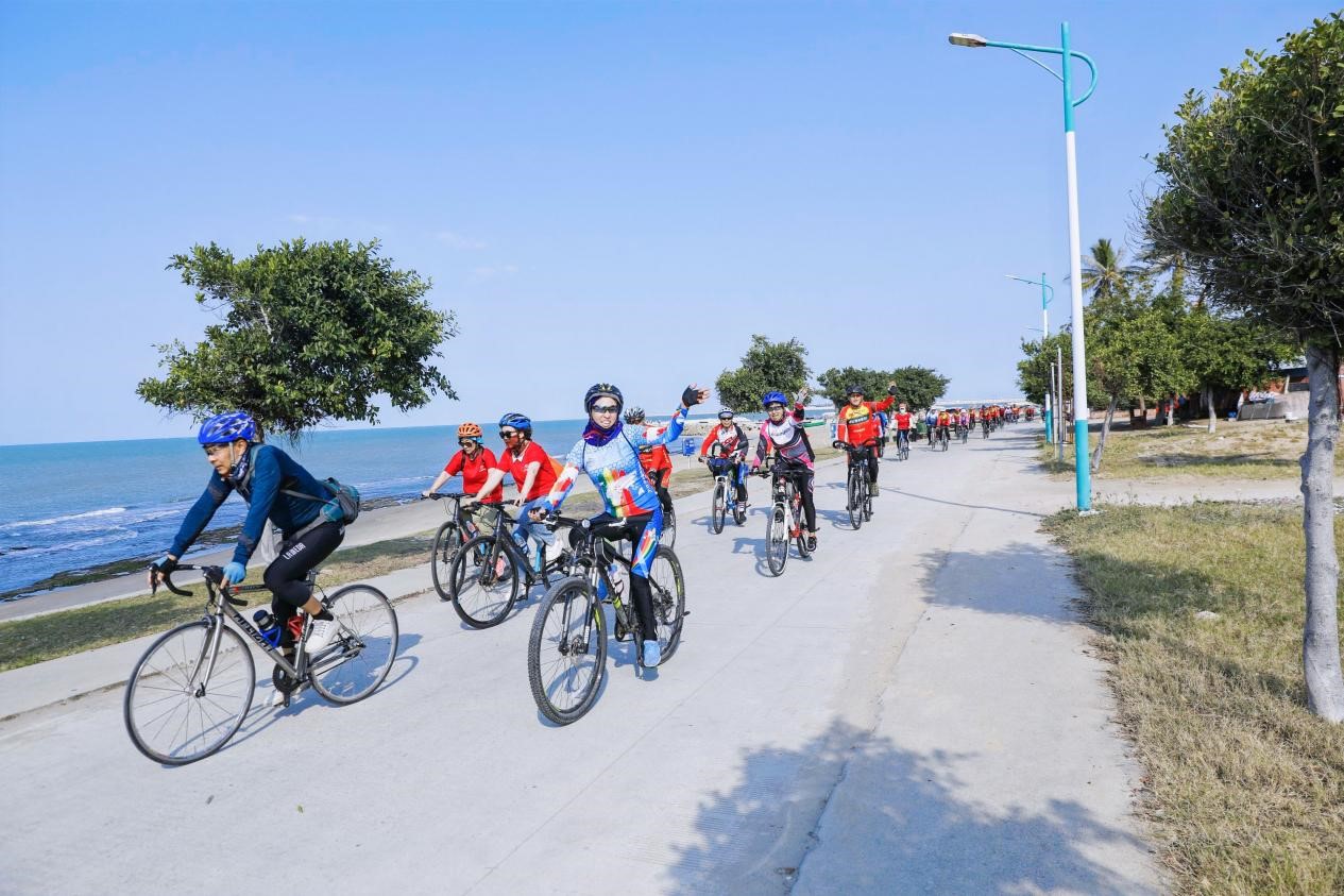 除新春市集之外,打卡海南环岛旅游公路乐东段以及莺歌踏浪驿站也是本次活动一大亮点。本次骑行线路为莺歌海镇亲水广场→莺歌海礼堂→莺歌海盐场-天空之境→海南环岛旅游公路莺歌踏浪驿站→莺歌渔梦海乐园→莺歌海镇亲水广场,全程29.05Km。骑行爱好者在环岛旅游公路上,一边观赏着公路两旁的滨海田园风光,一边享受着骑行运动的惬意。