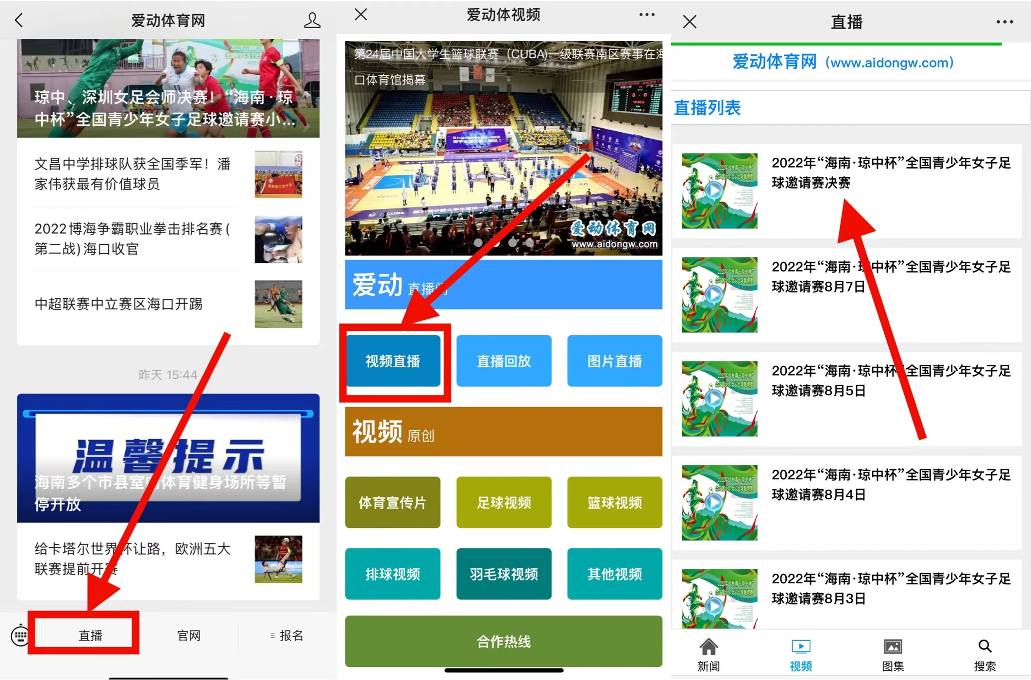 关注【爱动体育网】微信公众号-点击子栏目【直播】-【视频直播】-【2022年“海南·琼中杯”全国青少年女子足球邀请赛决赛】,即可观看精彩赛事。