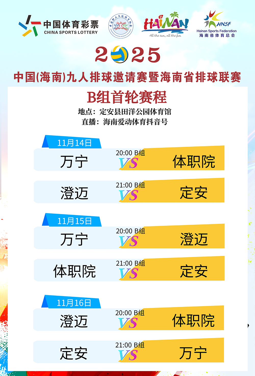 本届联赛将于11月14日-16日转场至定安县田洋公园体育馆,B组的四支球队——万宁队、海南体育职业技术学院队、定安队和澄迈队将展开6场精彩对决。