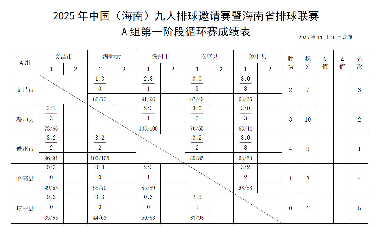 另一场比赛中,海南师范大学队发挥稳定,以3:0击败临高队。海南师范大学队以三胜一负的战绩位列A组第二。文昌队则以两胜两负的成绩排名小组第三,临高队以一胜三负的战绩位列小组第四,琼中队四负垫底。