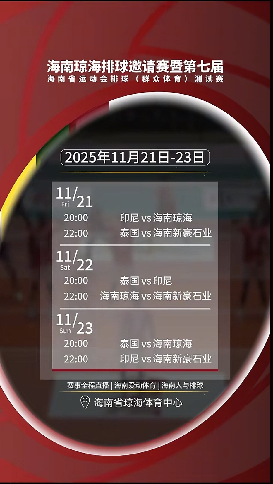 爱动体育讯 2025海南琼海排球邀请赛暨第七届海南省运会排球测试赛将于11月21日至23日在琼海体育中心举行。届时,印度尼西亚队、泰国队两支东南亚劲旅将携手来海南,与海南本土两支强队——海南新豪石业队、海南琼海队展开6场国际九人排球赛。海南爱动体育、海南人与排球抖音号将全程直播本次比赛。