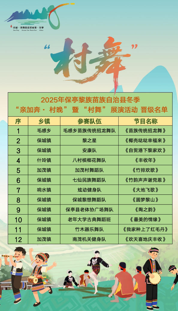 经过角逐,毛感乡、保城镇等12支优秀队伍产生。组委会将组织省内专业舞蹈家、编导组成的导师团进行作品全面优化调整和编排,提升村民舞台表现力。