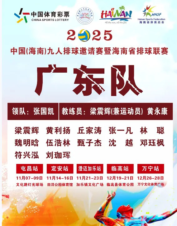 本次来海南参赛的广东队有多名台山籍球员,他们与海南球员一样,从小就有打九人排的习惯。广东队阵容中不仅有主攻手黄利扬、张一凡等多次来海南参加商业排球比赛的球员,还有广东男排青年队的符兴泓,这位小将来自海南文昌。