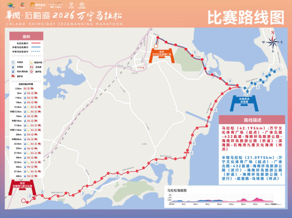 爱动体育在现场了解到,今年万宁马拉松定于1月25日上午7:00鸣枪起跑。以“万马奔腾,您「宁」来当先”为主题,比赛设马拉松和半程马拉松,路线起点设于万宁市文化体育广场,沿途串联432县道、海南最美环岛旅游公路,最终抵达石梅湾九里文化海湾。半程马拉松也从万宁市文化体育广场出发,沿海南环岛旅游公路前行。