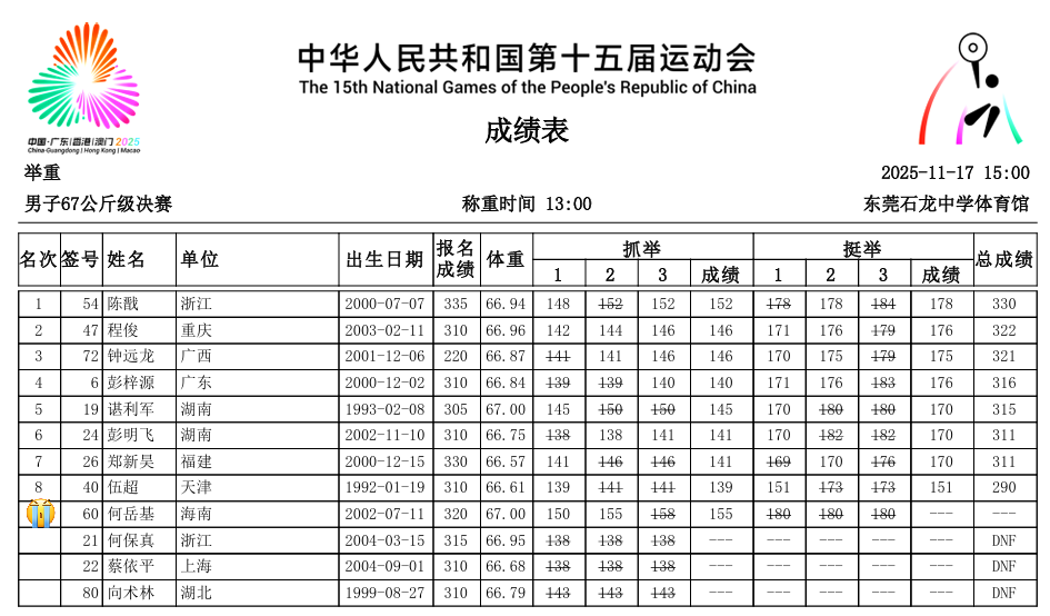 爱动体育讯 11月17日下午,在东莞进行的第十五届全运会举重男子67公斤级决赛中,海南选手何岳基抓举155公斤平亚洲纪录、世界纪录,但挺举180公斤三次试举皆失败,痛失奖牌,重演四年前全运会失利的一幕。