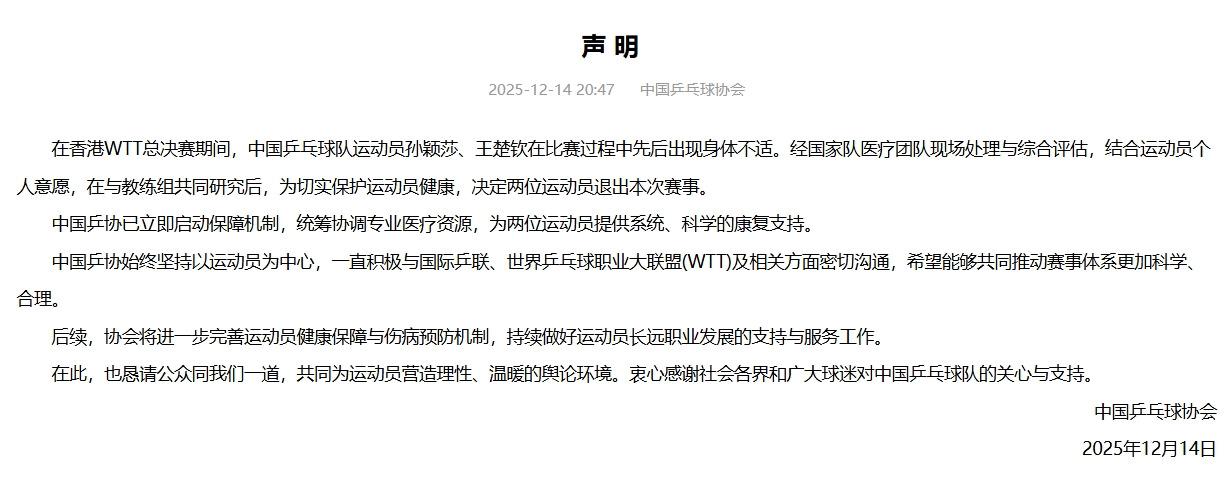 本次总决赛期间,国乒主力孙颖莎、王楚钦因伤先后退出女单和男单比赛,引发外界广泛关切。中国乒乓球协会于14日晚间就此发布声明。