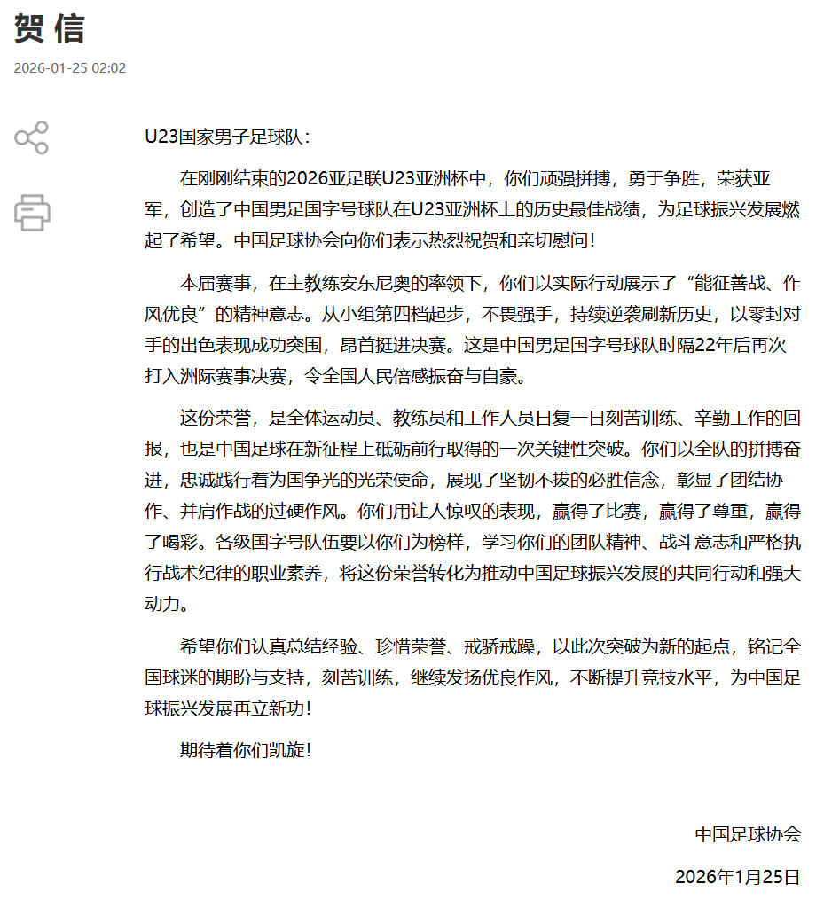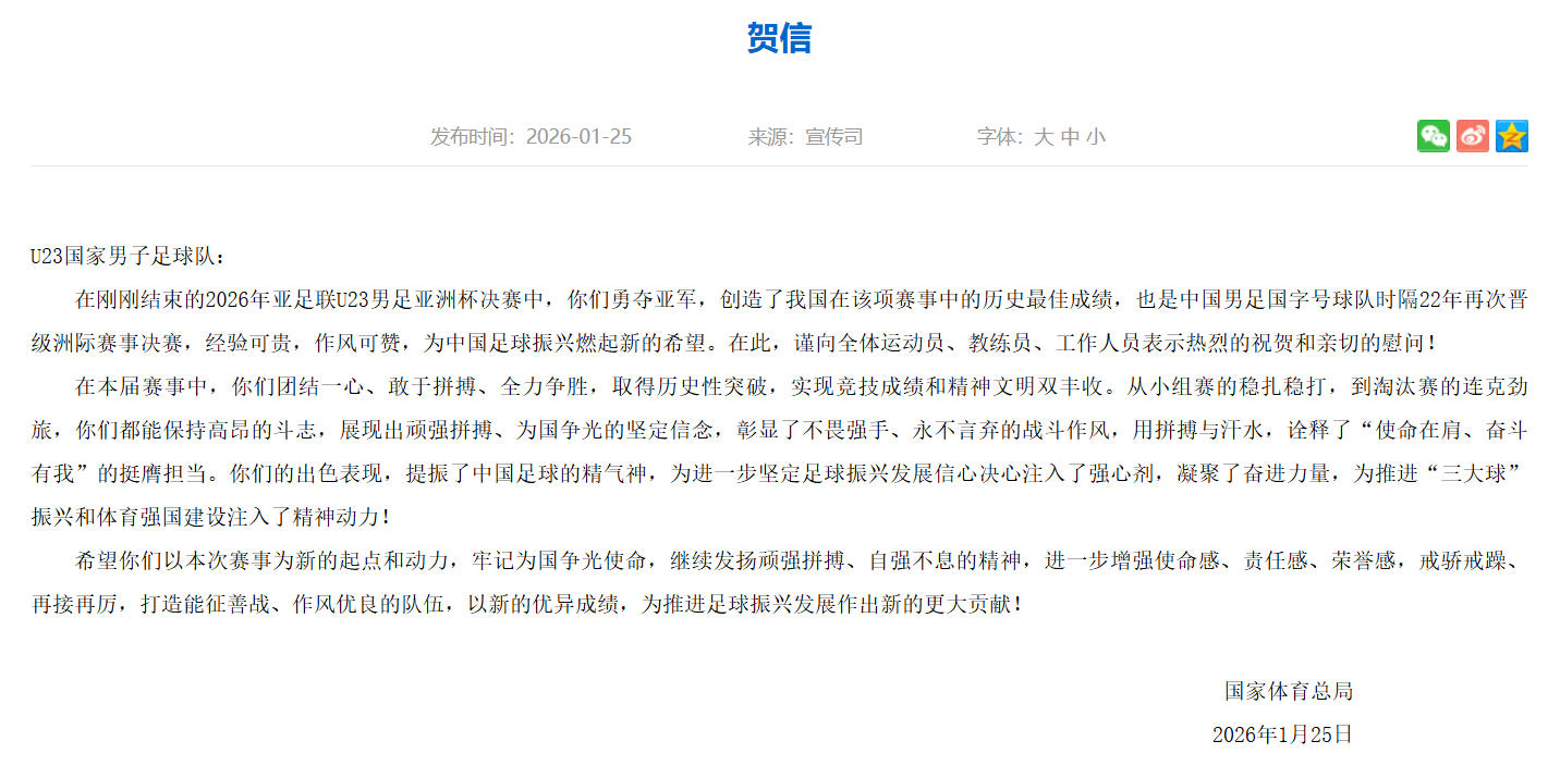 U23国足创历史夺亚洲杯亚军!体育总局、中国足协致贺信