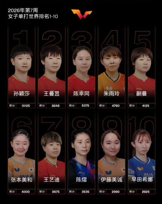 女子单打方面,孙颖莎以10125分稳居女单世界第一,优势巨大。王曼昱则以8248分紧随其后,陈幸同5375分位列第三。