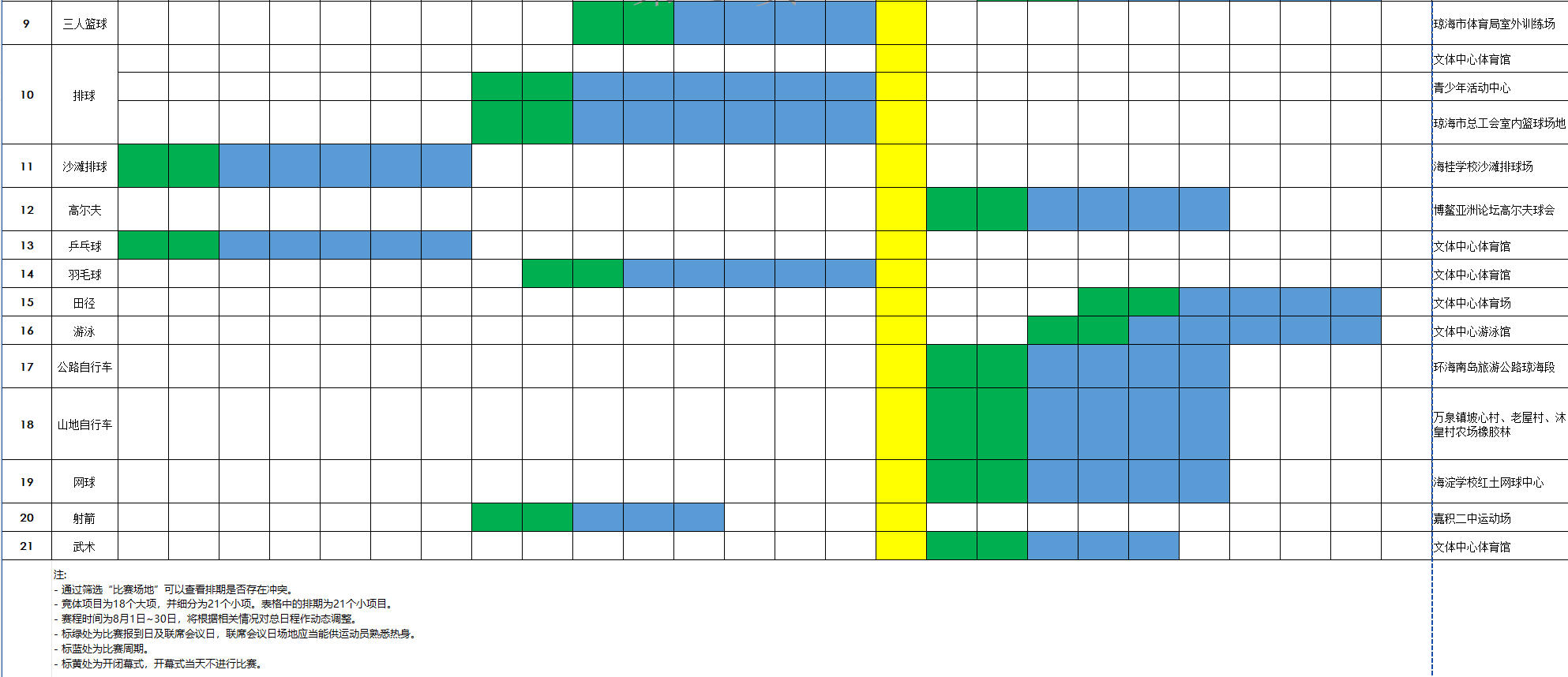 爱动体育讯 日前,海南省旅文厅公布海南省第七届运动会竞技组各项目比赛时间及地点。海南省第七届运动会是海南自贸港封关运作后举办的首届省级综合性运动会,将于今年8月16日至26日在琼海市举行。