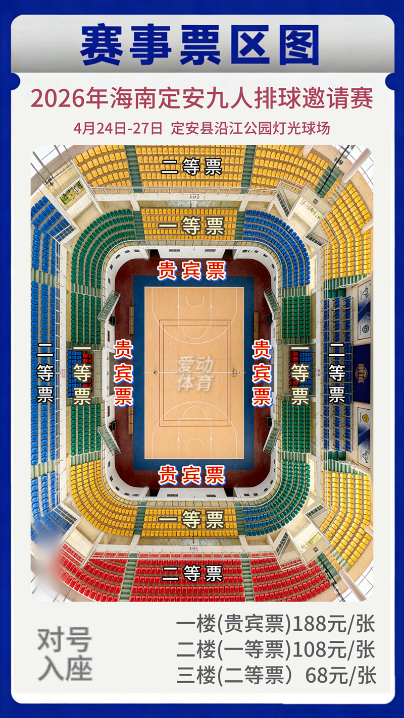 爱动体育讯 4月1日,2026年海南定安九人排球邀请赛组委会正式公布票价,亲民定价直接拉满,最低只要68元就能现场看高水平排球赛,球迷们速来集合。