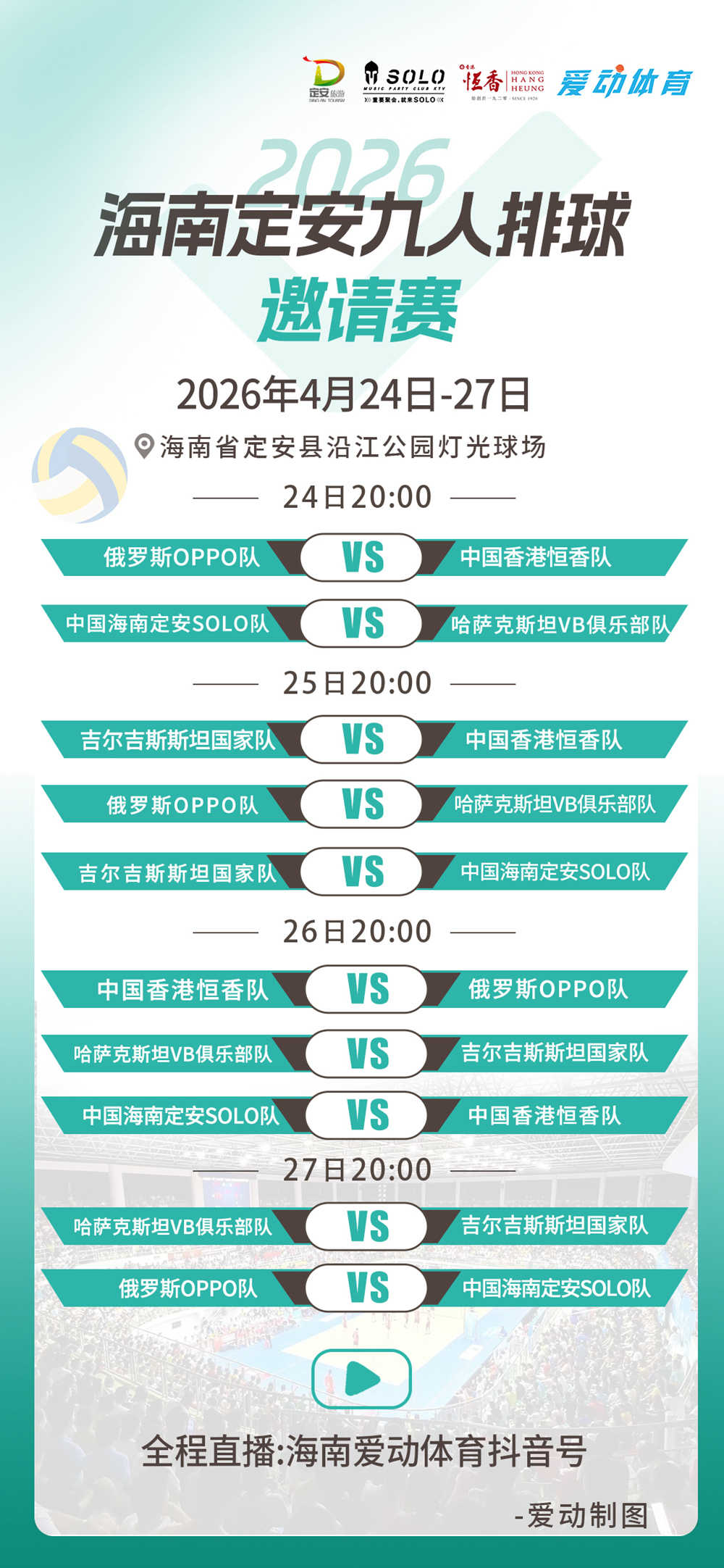 爱动体育讯 4月2日,2026年海南定安九人排球邀请赛组委会正式公布了本次比赛的赛程,俄罗斯OPPO队VS中国香港恒香队将于4月24日晚20点打响揭幕战,而中国海南定安solo队将连续激战4晚,为球迷们带来一场场精彩对决。