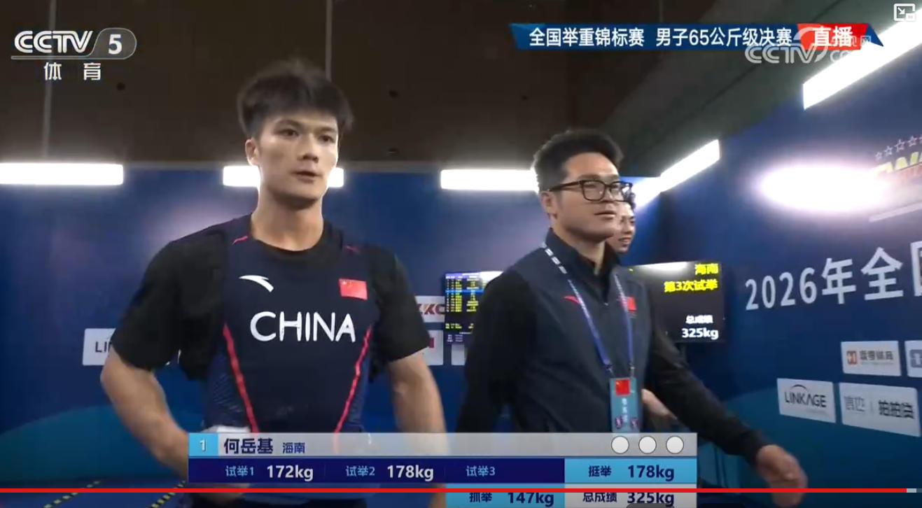 爱动体育讯 4月21日,2026年全国男子举重锦标赛在四川宜宾举行。海南举重运动员何岳基获得男子65公斤级抓举、挺举和总成绩三枚金牌,以总成绩325公斤刷新了该级别全国纪录。