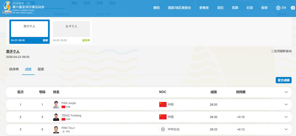 爱动体育讯 4月22日晚,第六届亚洲沙滩运动会开幕式在三亚亚沙公园举行。在游跑两项男子个人赛中,中国队选手范俊杰夺冠,斩获本届赛事和中国体育代表团首枚金牌。