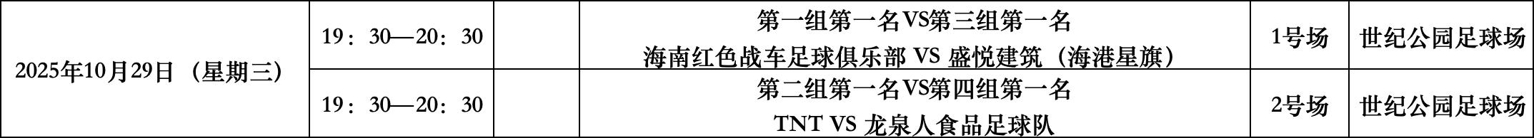 10月29日晚,半决赛将在海口世纪公园足球场进行。对阵分别是:海南红色战车足球俱乐部VS盛悦建筑(海港星旗),TNT队VS龙泉人食品足球队。