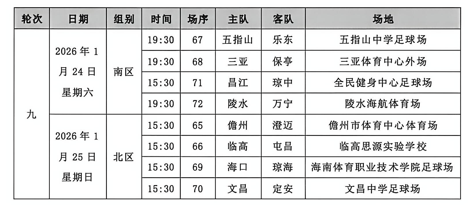 北区4场比赛则全部安排在1月25日15:30同时开球。北区目前仅海口和儋州两队确定晋级,剩下的两个晋级名额将在琼海、定安、屯昌、文昌、澄迈5支队伍中产生,最后一轮的胜负关系将直接决定晋级名额的归属。