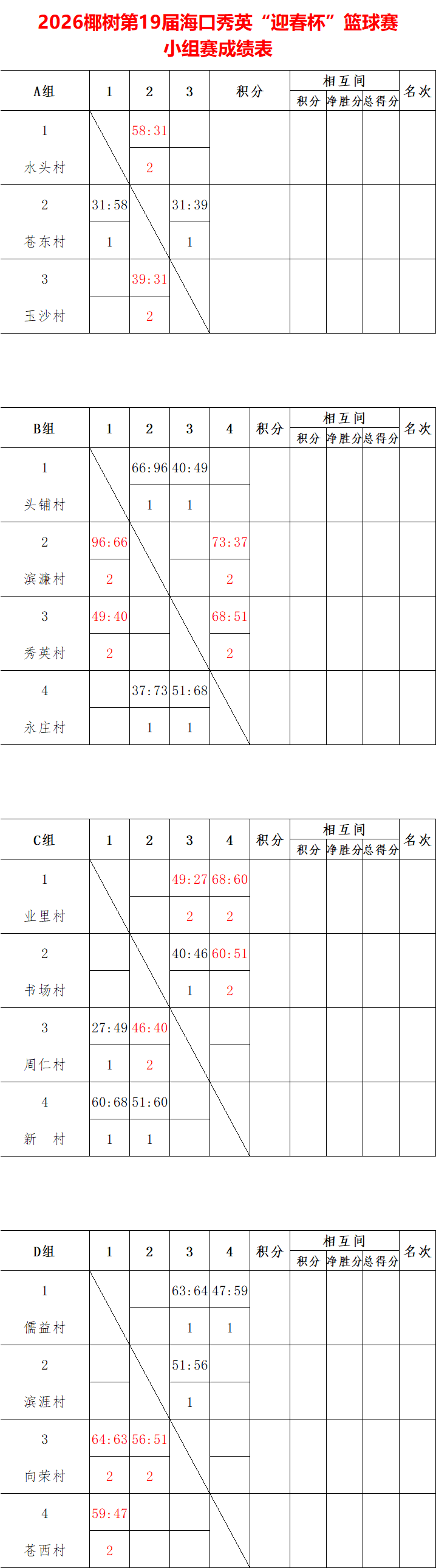 D组:向荣村64:63儒益村、向荣村56:51滨涯村、苍西村59:47儒益村;