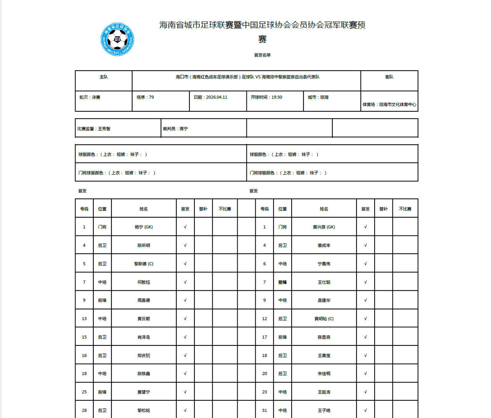 爱动体育讯 4月11日晚,“启航自贸港”第一届海南省城市足球联赛决赛海口队VS琼中队的比赛将在琼海打响。赛前双方的首发名单如下: