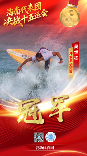 爱动体育讯 11月16日上午,第十五届全运会冲浪项目决赛在汕头市南澳县青澳湾展开激烈角逐。在男子短板决赛中,海南冲浪健儿吴世栋凭借高超的冲浪技术和稳定的临场表现,战胜了河北选手董子豪,为海南代表团再添1枚宝贵的金牌。