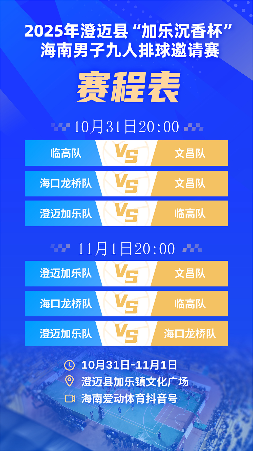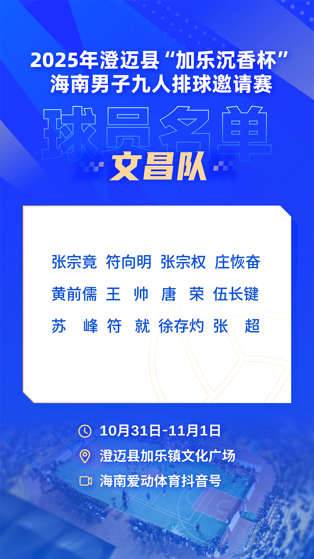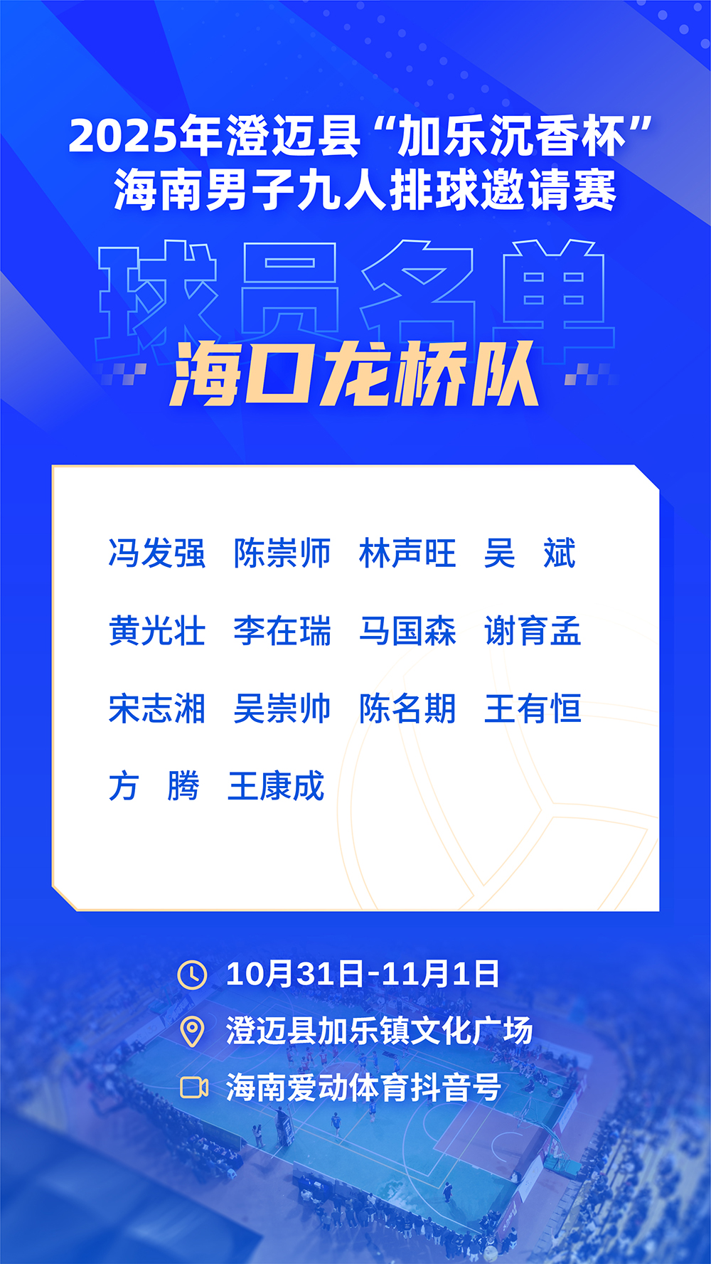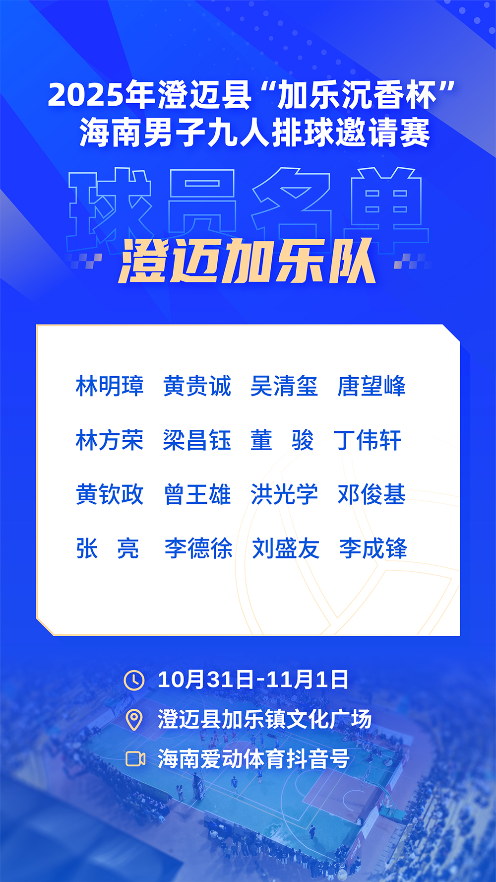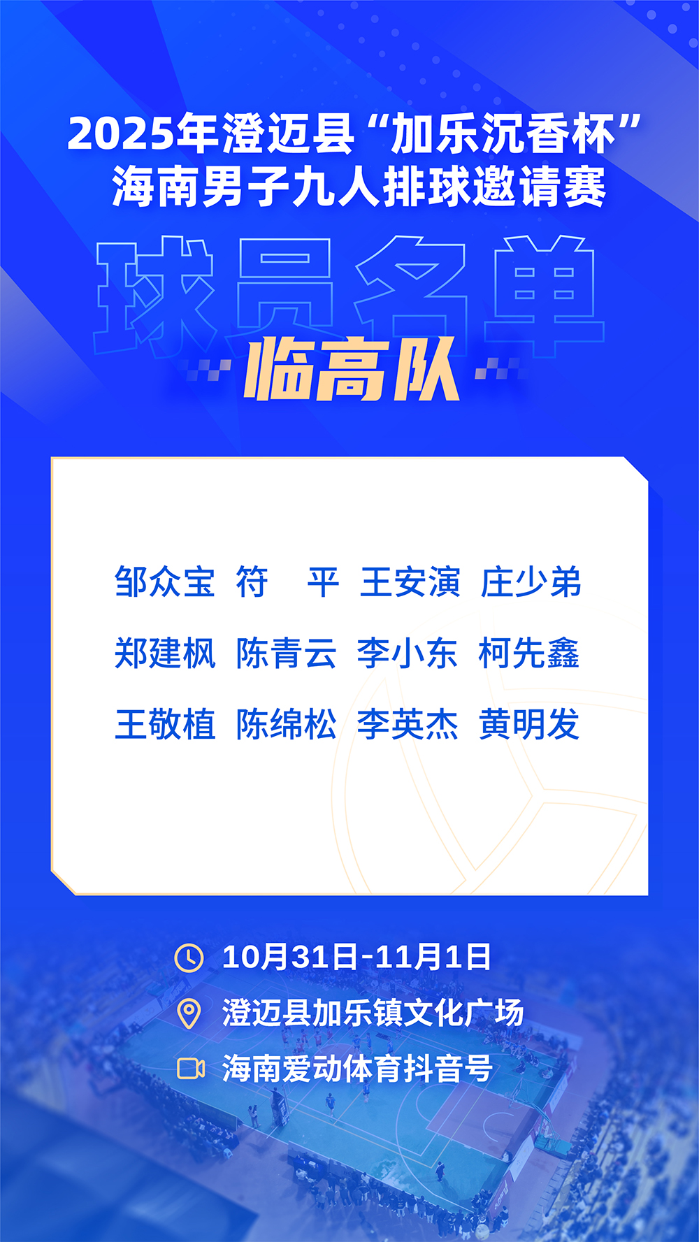 爱动体育讯 10月19日,2025年澄迈县“加乐沉香杯”海南男子九人排球邀请赛组委会更新参赛名单,并公布赛程。“海口五虎”全员就位,林明璋回归澄迈加乐队,冯发强、陈崇师则加入海口龙桥队,文昌队和临高队阵容保持不变。